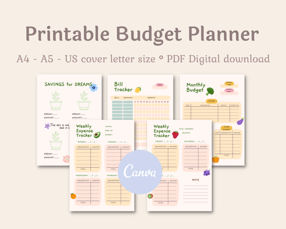 Printable Budget Tracker Templates Instant Download | Canva Planner Design | Pastel Fruity | Bullet Journal Planner